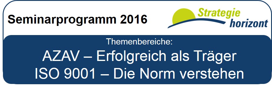 Wir möchten unsere Beratungserfahrung gern mit Ihnen teilen und starten 2016 wieder mit einem neuen Seminarangebot. Neben der Ausbildung zum Qualitätsmanagementbeauftragten und Veranstaltungen zur Revision der ISO 9001, gibt es auch Seminare mit denen Sie Ihre Kompetenz im AZAV Bereich ausbauen können. Lernen Sie Produkte und Produktportfolios strategisch zu entwickeln, Maßnahmen zu kalkulieren und Ausschreibungen zu gewinnen. Als Extra bekommen Sie zu jedem gebuchten Seminar eine vergünstigte individuelle Beratung. Das gesamte Seminarprogramm finden Sie hier.